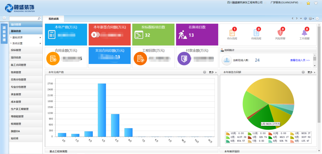 通过项目管理系统,不仅规范了业务流程和业务时效,也规范了工作的标准及质量要求。同时,首页直观反映出领导层最为关心的项目数据,,实现数据可追溯,过程可留痕,降低成本和经营风险,逐步实现项目成本管控需求。