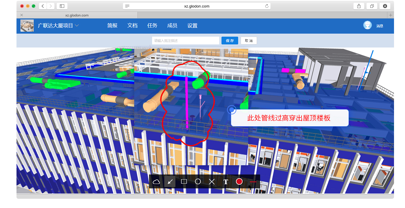 BIM可视化交流与协作2、BIM模型各方共享、轻量化在线浏览审核,问题批注并发起任务解决。具体功能含:按楼层、专业等查看模型、构建属性查看、小地图导航、版本比对、快照视点保存、模型自由剖切、行走漫游、问题批注。 |