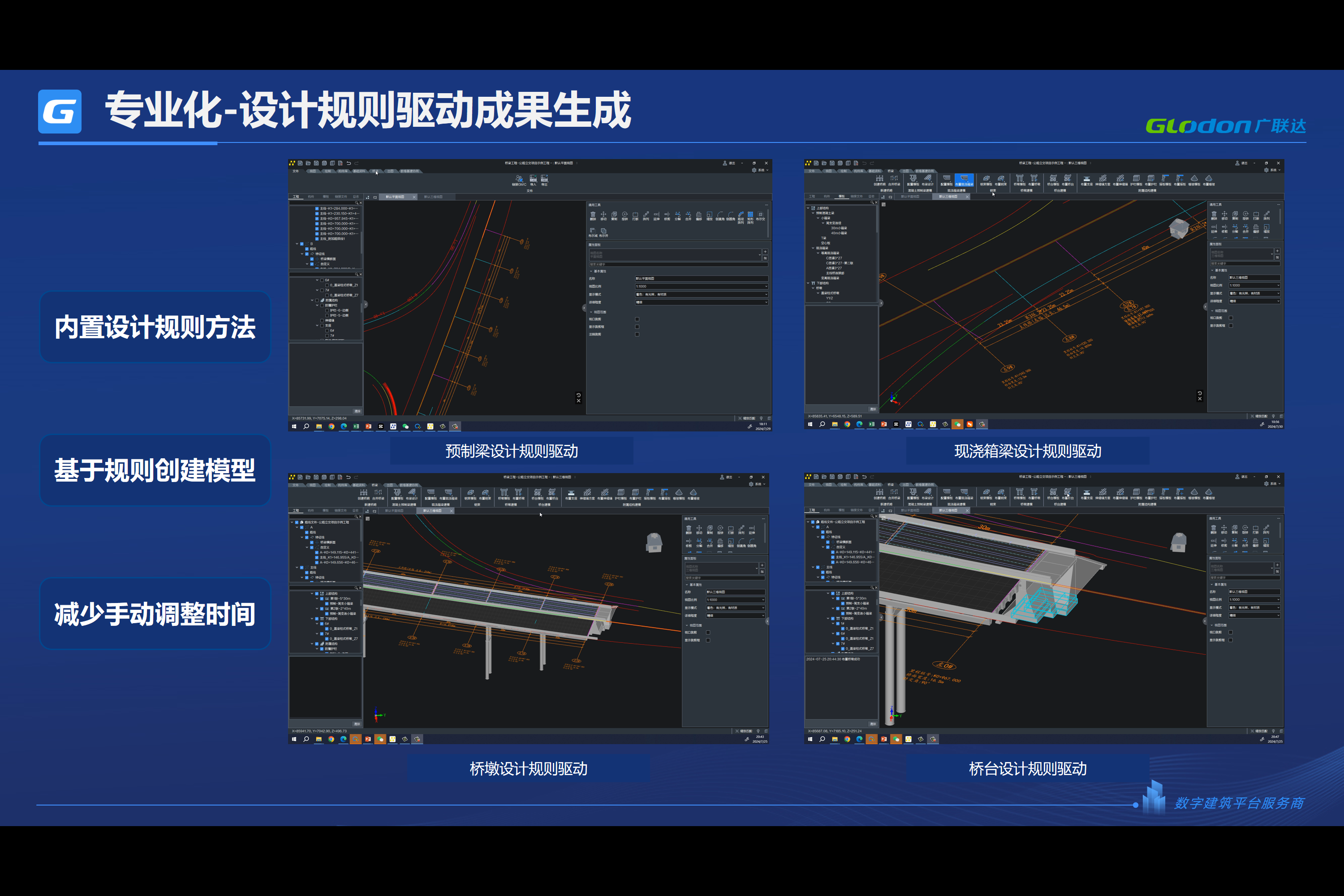 专业化-设计规则驱动成果生成软件内置设计规则和方法,能够基于规则创建模型,减少了手动调整的时间,大幅提高效率。如上部预制梁、现浇箱梁布置,在设计中通过指定布设方法即可按照规则创建上部梁体模型;下部墩台设计时通过参数一览表中指定各部分构件规则驱动模型创建,设计过程勿需逐个指定模型参数,减少手动设计调整时间,极大地提高了设计建模效率。 |