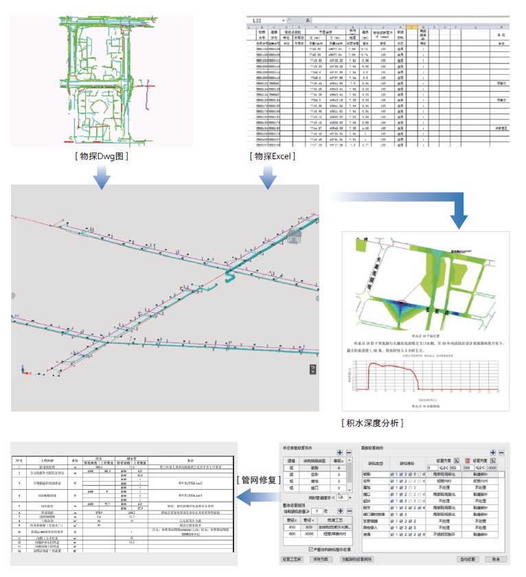 现状管线建模、管网评估分析寻找薄弱点、改扩建设计及管网修复。